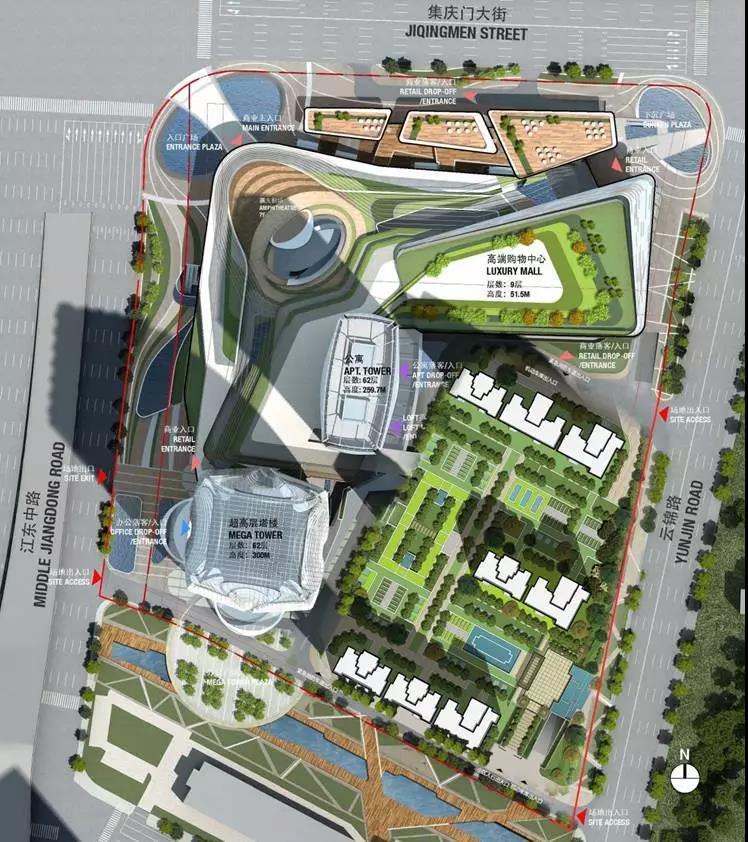 南京G11占地面積約6.7萬m2,總建筑面積約74.8萬m2,擁有3棟150m高的超高層住宅、1棟300m高的超高層辦公樓、1棟260m高的超高層酒店式公寓以及9層商業綜合體,業態齊全的它在規模上可以稱之為超大工程;
