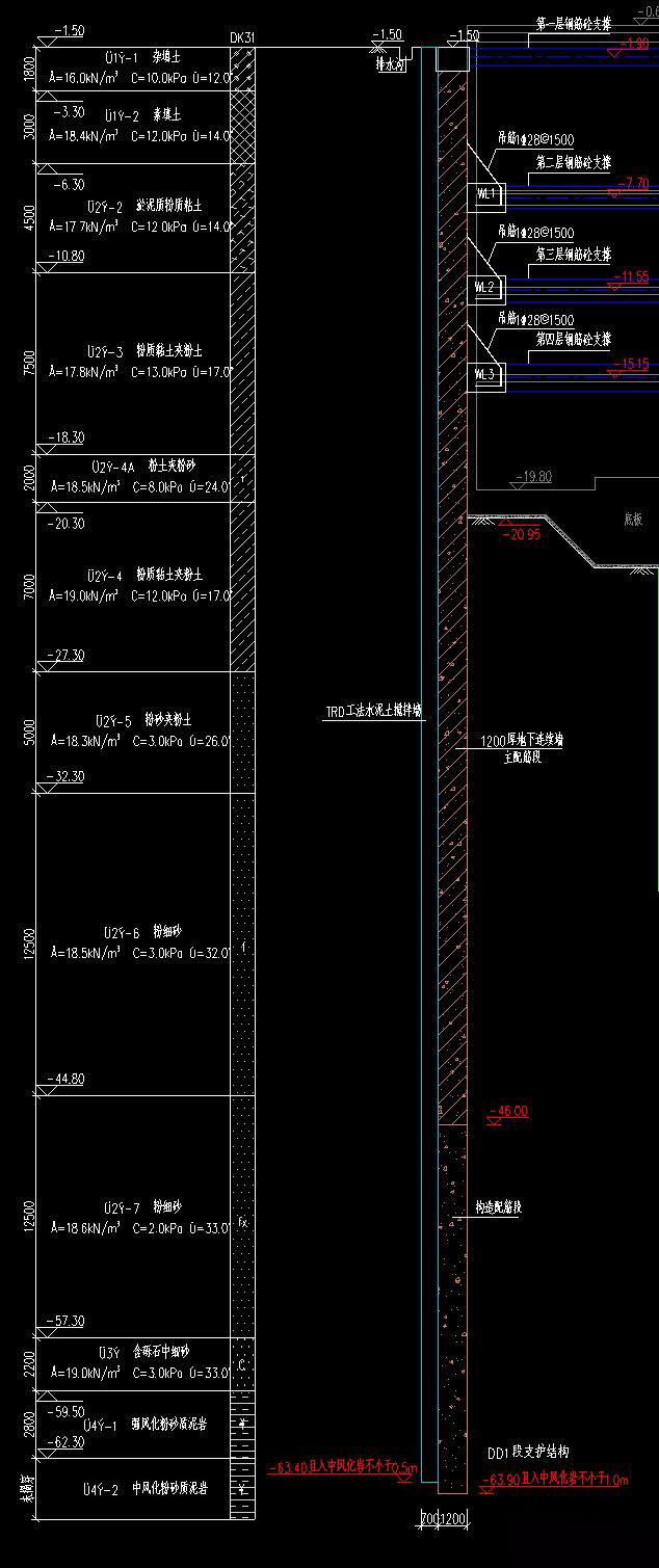 G11項目基坑面積達6萬多m2,大部分區域為4層地下室,深度約22m,局部深坑深達30m,住宅區域局部2層~3層地下室。項目鄰近地鐵,地質條件極差,地下水豐富,為保護地鐵,在土地出讓協議中已明確整個地塊(含內部分區分隔圍護墻)“采用TRD等厚水泥土攪拌墻 地下連續墻雙重止水帷幕”。地下連續墻厚度為1.0m,墻深60m,入巖1m。