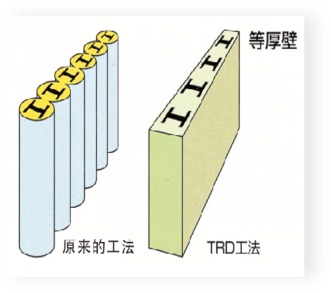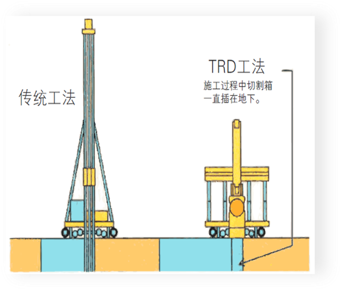 TRD工法,被稱為等厚水泥土連續攪拌墻工法,由浙江吉通地空建筑科技有限公司在2009年國內首次引進研發,是將滿足設計深度的附有切割鏈條以及刀頭的切割箱插入地下,在進行縱向切割橫向推進成槽的同時,向地基內部注入水泥漿以達到與原狀地基的充分混合攪拌在地下形成等厚度連續墻的一種施工工藝。