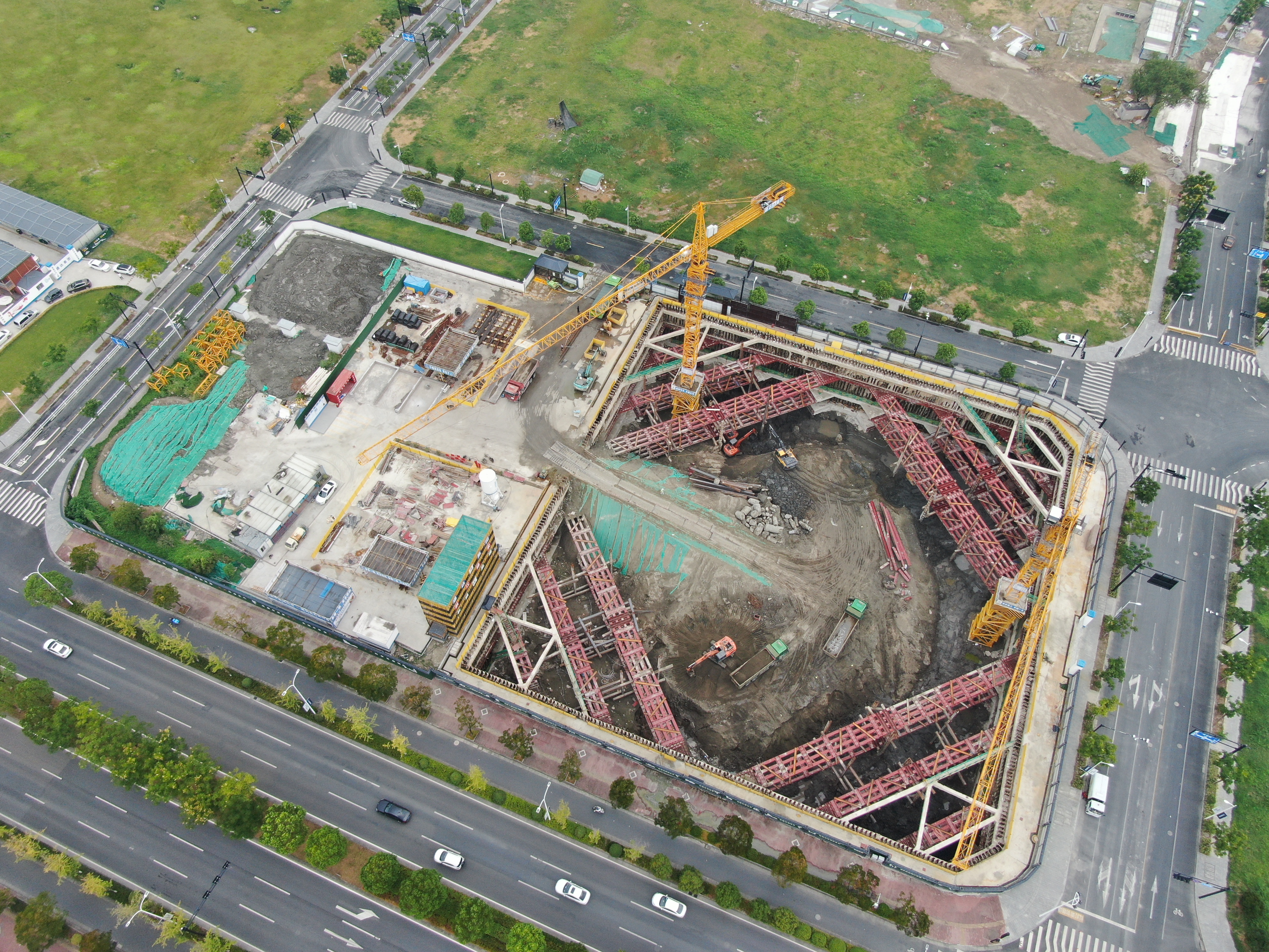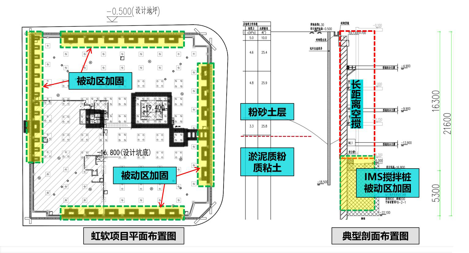 虹軟視覺人工智能產業化基地項目工程位于市濱江區濱興路與江淑路交叉口,基坑開挖深度約為16.3m,電梯井深坑高差3.4m。由浙江吉通進行施工,采用TRD工法兼作支護結構和止水帷幕,坑內設置IMS攪拌樁被動區加固和重力式擋墻,設置一道鋼筋砼支撐和三道預應力型鋼組合支撐的圍護方式。