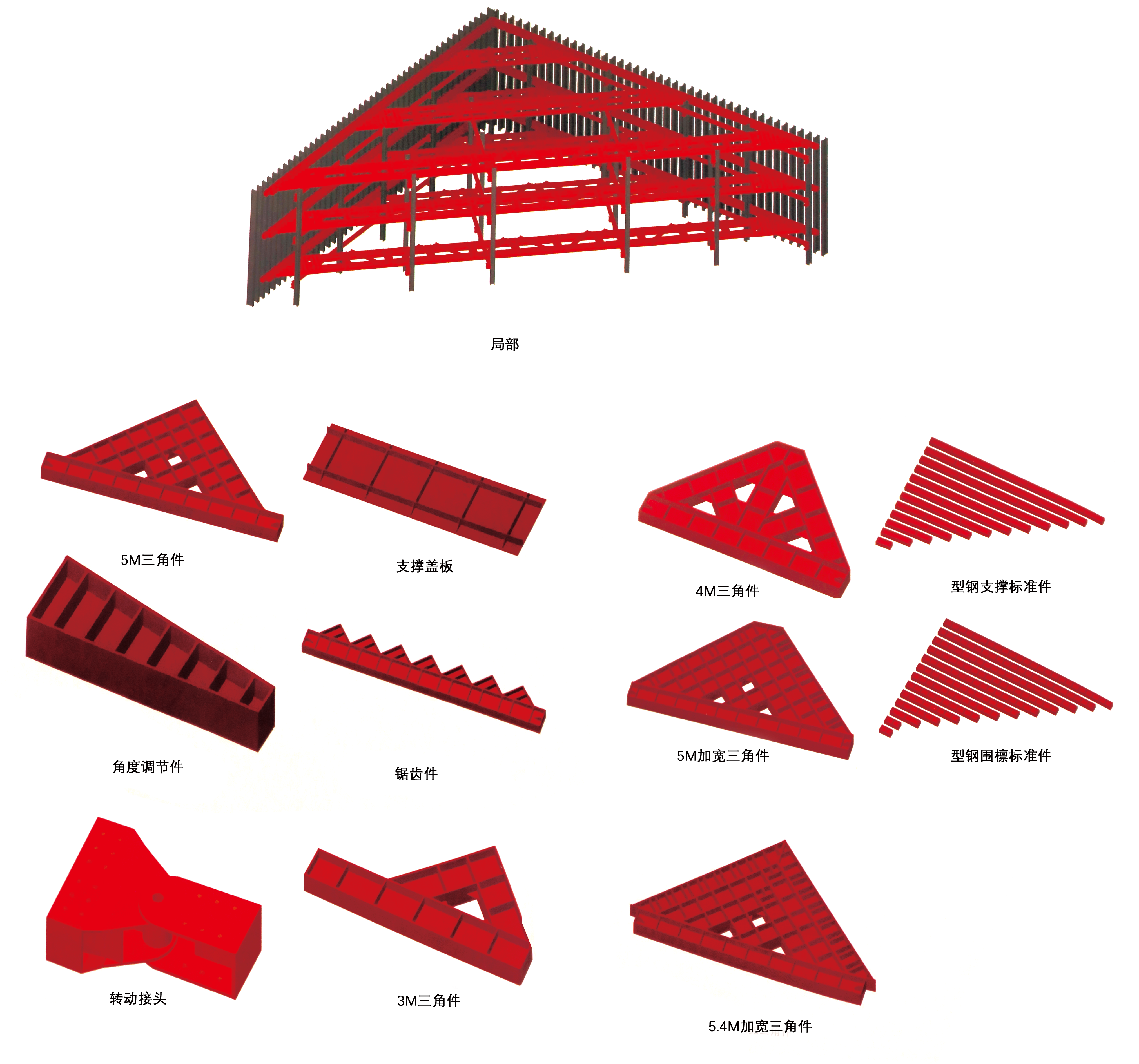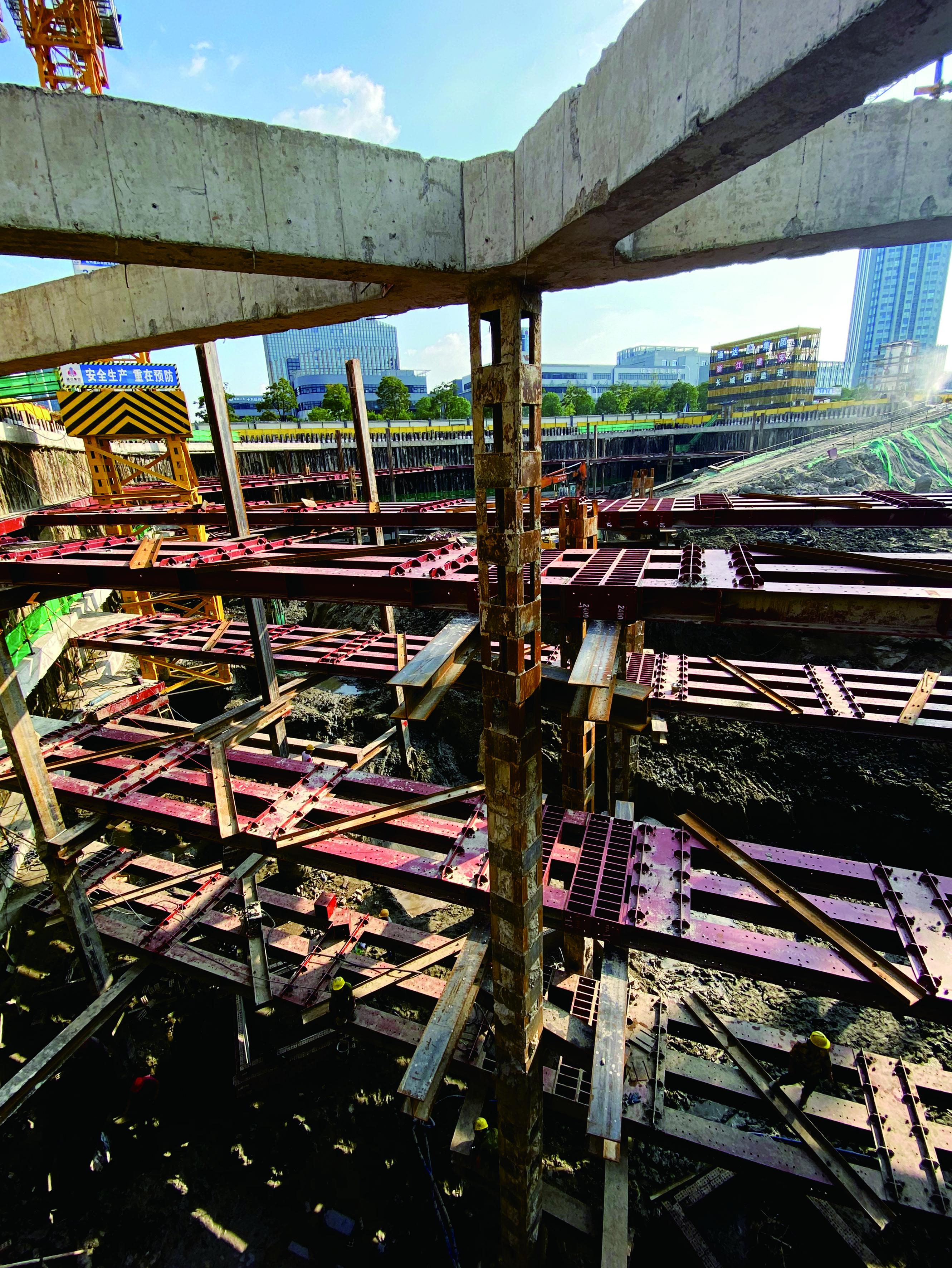 整個體系主要由對撐、角撐、圍檁、立柱、支撐梁和連接件組成,可根據基坑的不同形狀及要求設置月牙梁、斜拋撐和拱形撐,也可與混凝土支護結構結合使用,以滿足各類基坑支護要求。該技術可廣泛應用于地下室、地下車庫、地鐵、隧道、綜合管廊等工程。