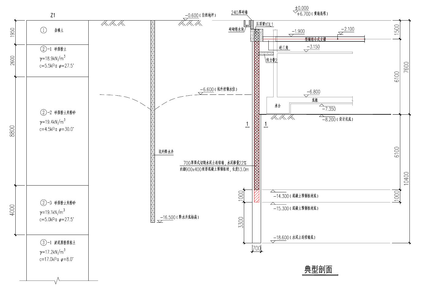 1)圍護樁采用700mm厚渠式切割水泥土連續墻內插900*400矩形混凝土預制板材。