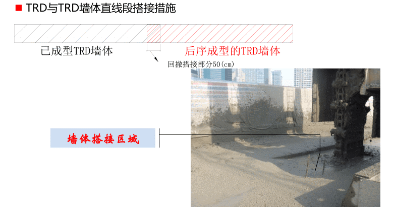 1、本工程TRD水泥土攪拌墻采用三工序成墻方法完成攪拌墻體施工,即切割箱鉆至預(yù)定深度后,首先注入挖掘液先行挖掘一段距離,然后回撤至原處,再注入固化液向前推進(jìn)攪拌成墻。水泥采用等級P.O42.5級普通硅酸鹽水泥,墻厚700mm,水泥摻量不小于25%(450kg/m3),水灰比1.0~1.5,每立方被攪拌土體摻入10%膨潤土。