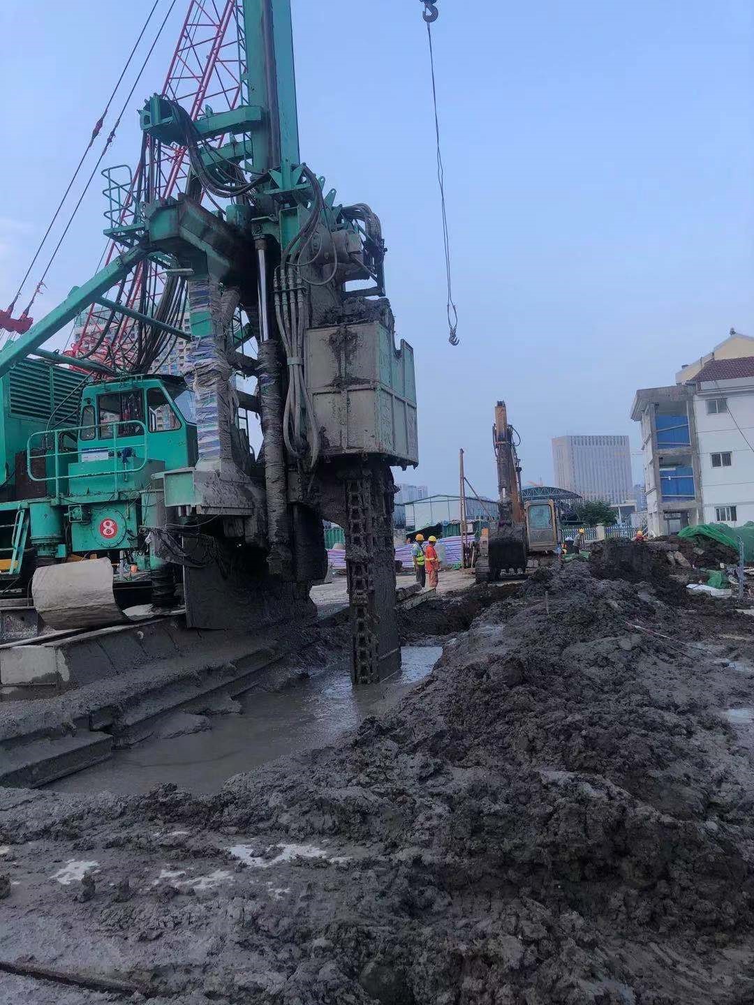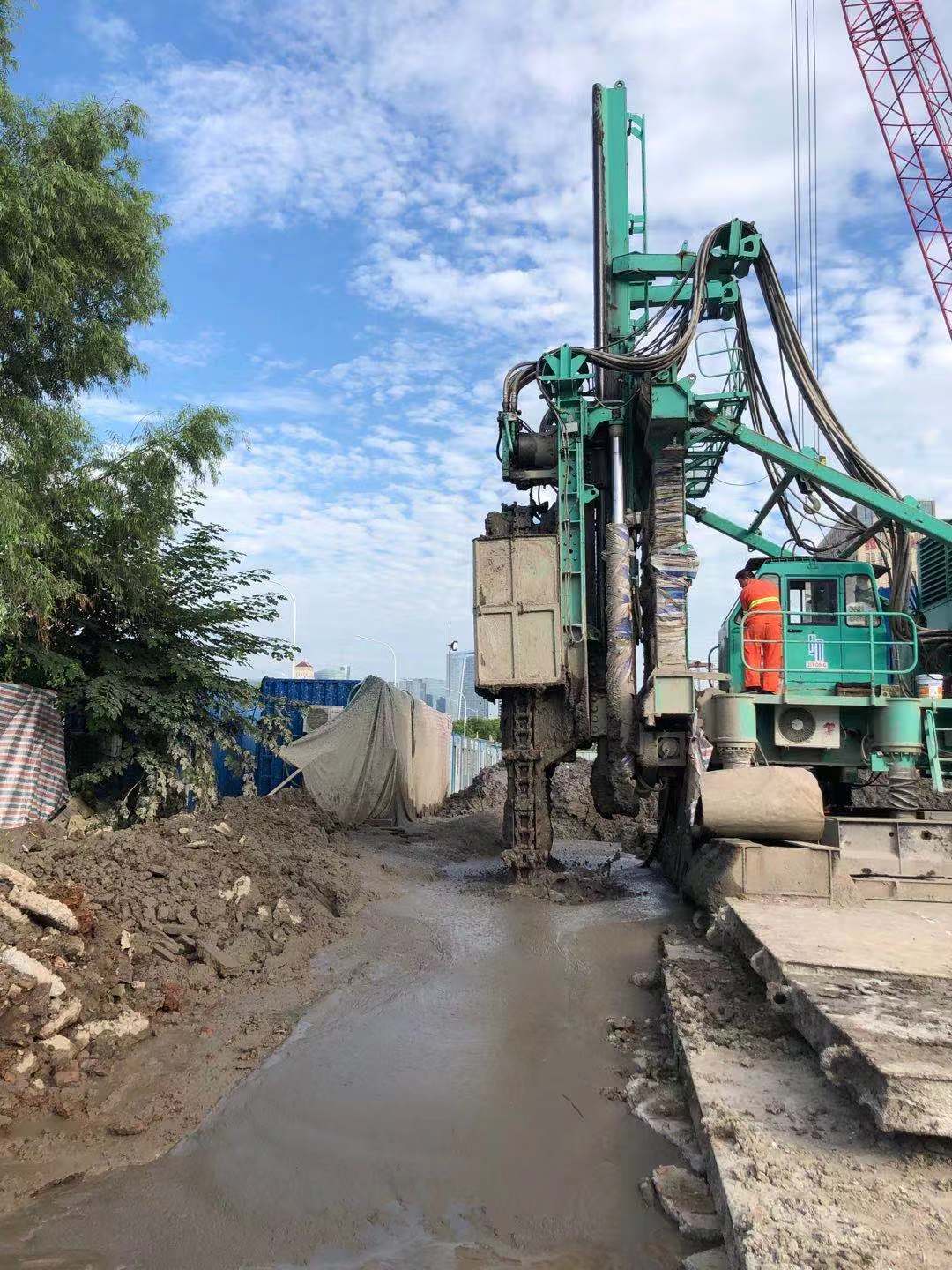 本工程圍護結(jié)構(gòu)采用700mm等厚度水泥土攪拌墻(TRD工法)作止水帷幕。因受地下46.5米以下強風(fēng)化巖層和中風(fēng)化巖層的影響,使得TRD工法機無法對其進(jìn)行切割挖掘,故先采用旋挖引孔的預(yù)處理方式再施工TRD工法樁。