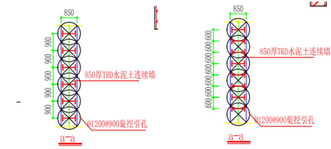 TRD工法采用850mm等厚度水泥土地下連續墻內插型鋼(H700×300×13×24@900)兼作圍護結構及止水帷幕,出土口區段采用型鋼加密(@450)進行加固,墻深進入中風化巖層深度不小于3m。