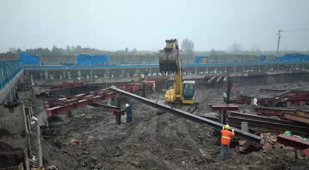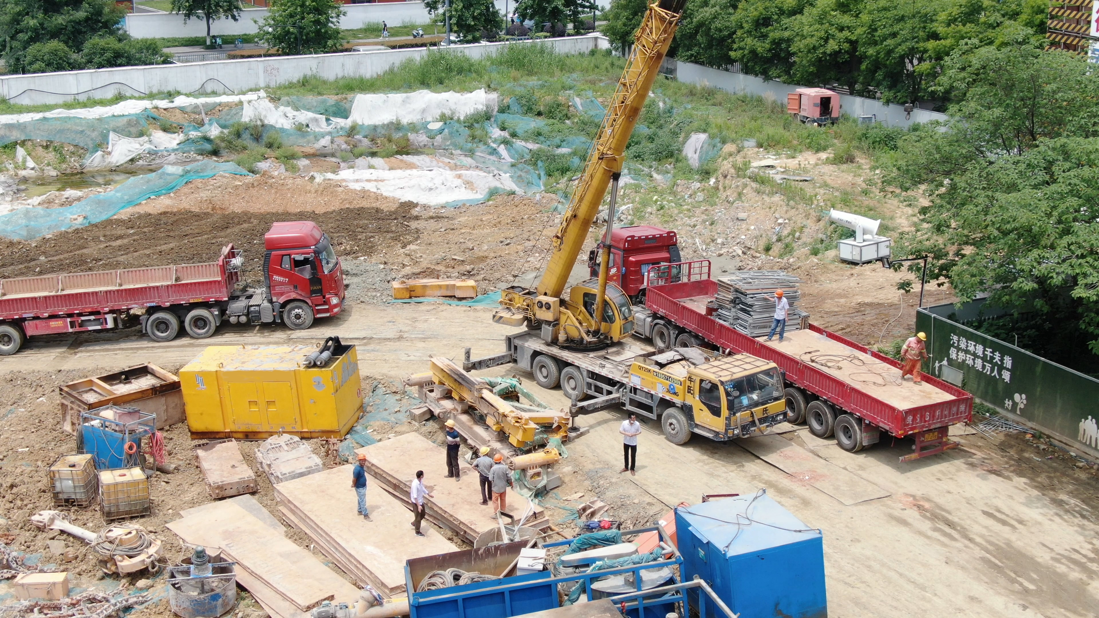 施工準備→土方開挖→測量定位/標高控制/復核→立柱樁施工→總包單位施工混凝土圍檁→預埋加壓件→安裝托座件→安裝支撐橫梁→安裝支撐→預應力施加→土方開挖→直至基坑開挖結束→施工澆筑混凝土墊層、底板→地下室結構強度達到設計強度→回收裝配式支撐→工程結束。本工程裝配式組合鋼構件安裝,采用分件吊裝的方法,本工程分2個流水段進行吊裝,分別吊裝支撐、角撐及型鋼部分。待螺栓緊固后,依次進行千斤頂安裝及預應力施加,然后進行輔助固定。現場吊裝劃分區域,吊裝采用塔吊、汽車吊進行現場安裝施工。