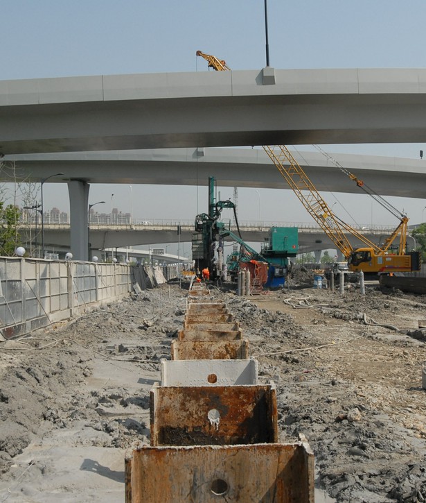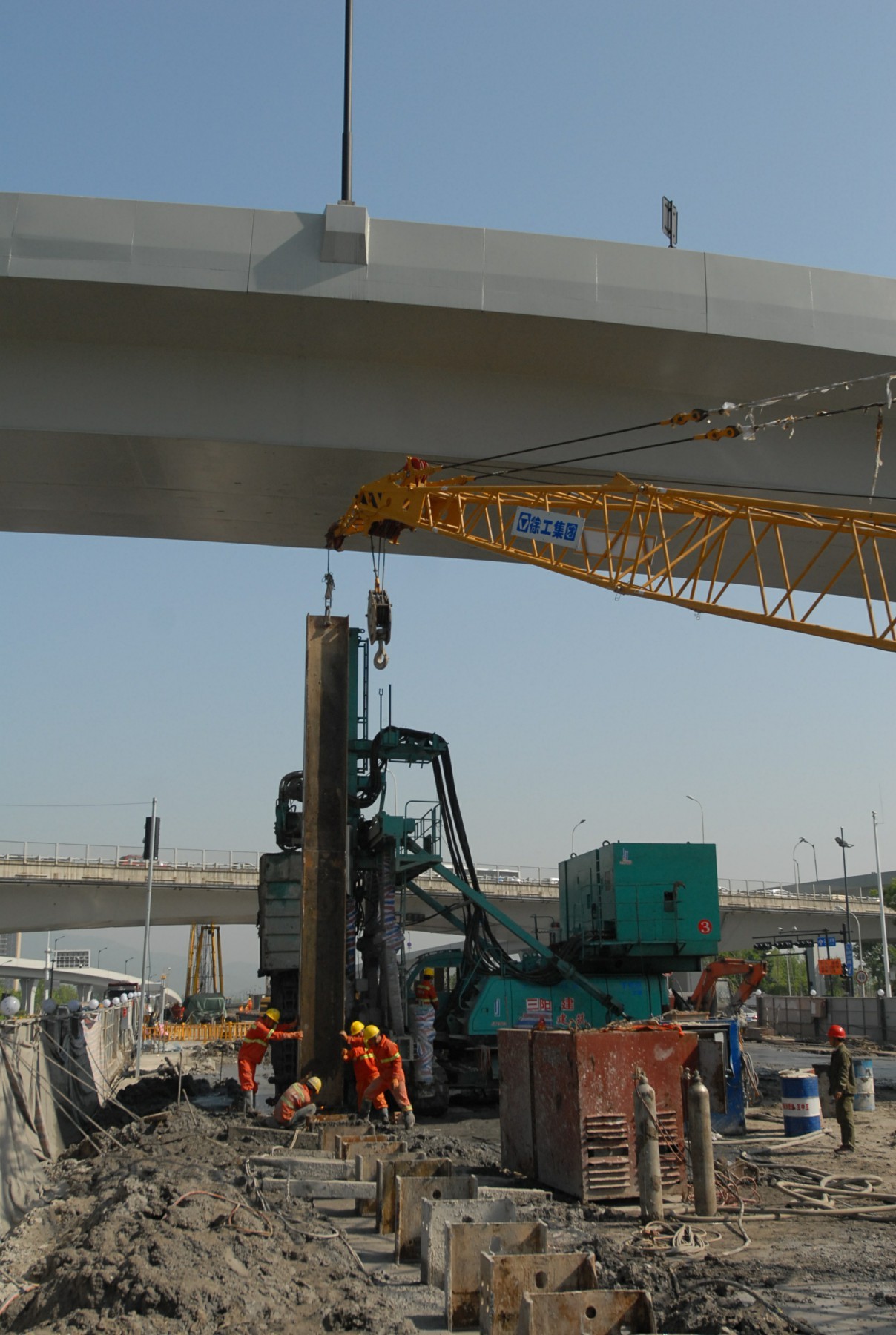 該項目情況特殊,要在兩座高架橋凈高分別為10.6米、11.2米橋下施工,TRD工法機設備高度低,更穩定,止水帷幕操作空間剛滿足施工要求,但施工處(橋下)要插入24.5米的型鋼就非常困難,我們采取分段插入,立焊,保質保量的完成了施工任務。