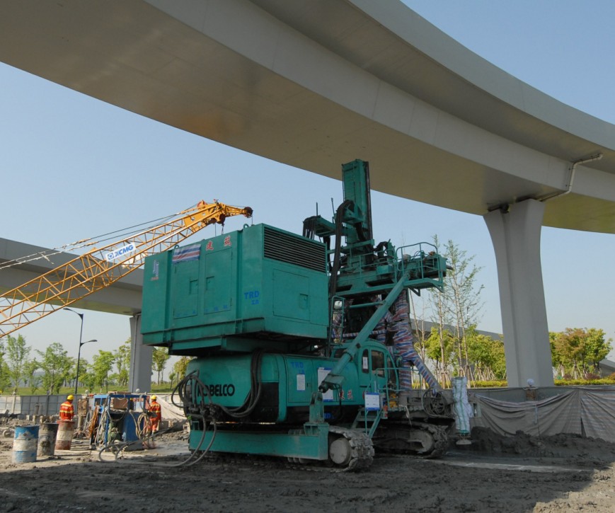 TRD工法(Trench-Cutting & Re-mixing Deep Wall Method),又稱等厚度水泥土地下連續墻工法,其基本原理是利用鏈鋸式刀具箱豎直插入地層中,然后作水平橫向運動,同時由鏈條帶動刀具作上下的回轉運動,攪拌混合原土并灌入水泥漿,形成一定強度和厚度的墻。