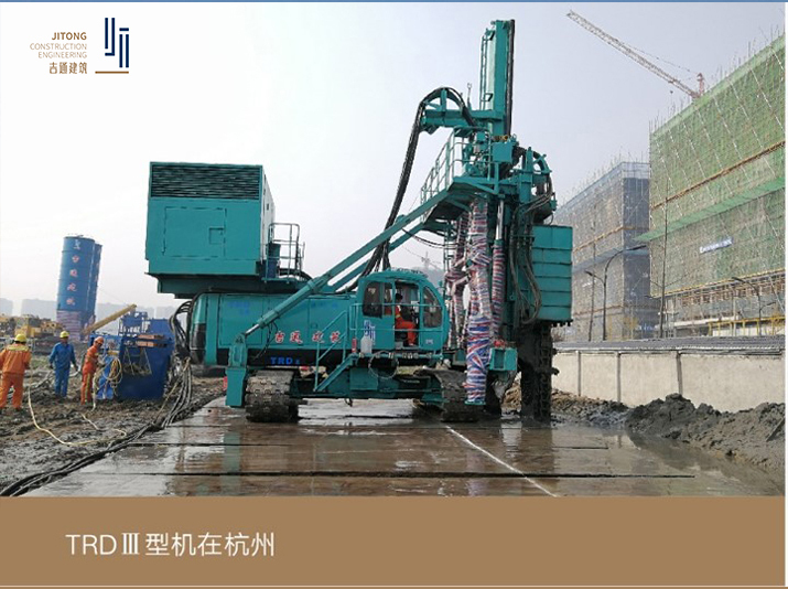 TRD工法是以鏈鋸式刀具為主要機具,在插入地基過程中鏈鋸式刀具與主機連接,回旋刀鏈鋸可豎向垂直或橫向水平移動進行對地下土體的切削,在刀具端頭噴出水泥漿硬化劑注入土體的同時注入高壓空氣使水泥漿與原位土體充分混合、攪拌將原位土體固結從而在地下形成一道等厚度的連續墻的一種施工工藝。