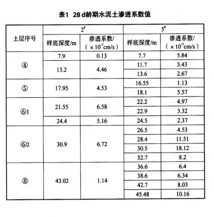 從滲透系數范圍可以推測:在黏土、粉土、以及粉質黏土層范圍內,經TRD工法作用,使該范圍土層得到充分攪拌,上下基本均勻一致,未出現黏土成塊和局部漿液富集的現象,水泥攪拌土結構致密。經試驗分析,水泥攪拌土滲透系數均在10^(-7)數量級,同土層施工效果的平均性較好。