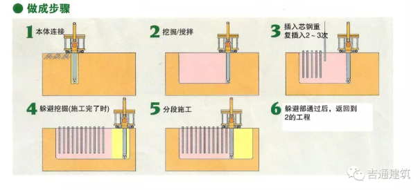 機(jī)械組裝﹥放樣復(fù)核﹥樁機(jī)定位﹥打入切割箱﹥先行挖掘(注入切削液)﹥回撤挖掘﹥攪拌成墻(注入固化液)﹥插入H型鋼﹥拔除型鋼