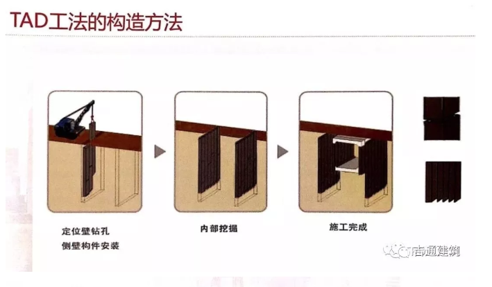 TAD工法(Trench cutting Assembled Diaphragm wall) 即渠式切割裝配式地下連續墻工法,該工法涉及在渠式切割水泥土連續墻(或雙輪鉸成墻)從水泥土墻中間插入預應力榫卯結構(鎖扣)鋼筋混凝土預制墻板形成裝配式地下連續墻的一種施工工藝。