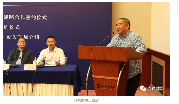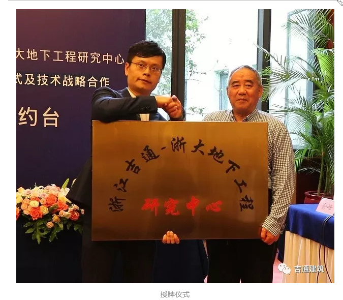 會議首先舉行浙江吉通—浙大地下工程研究中心成立授牌簽約儀式、浙江吉通地空建筑科技有限公司董事長江正兵、浙江大學濱海和城市巖土工程研究中心主任龔曉南院士進行簽約、并由龔曉南院士進行研究中心授牌。這標志著浙江吉通在施工技術研發和應用方面又邁出堅實的一步。